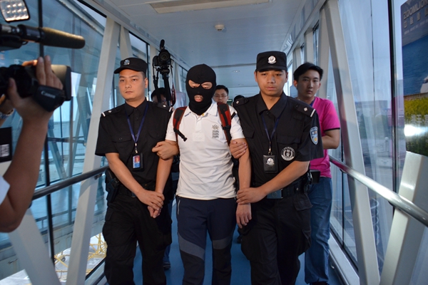 (潜逃泰国43天,涉嫌受贿犯罪、掩饰隐瞒犯罪所得的祁某某(中)在民警的押解下走出航班)