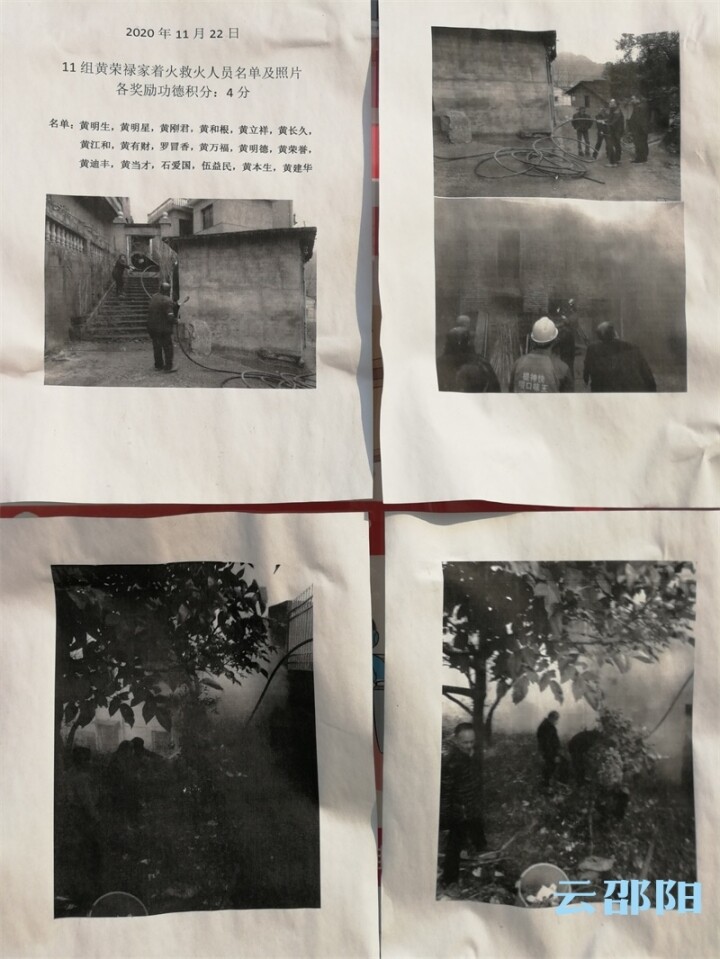 11月22日村民黄荣禄家失火,主动参与救火的村民都及时受到表扬并得到加分奖励
