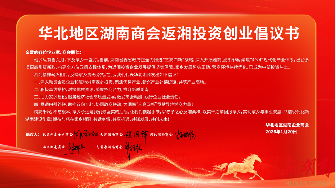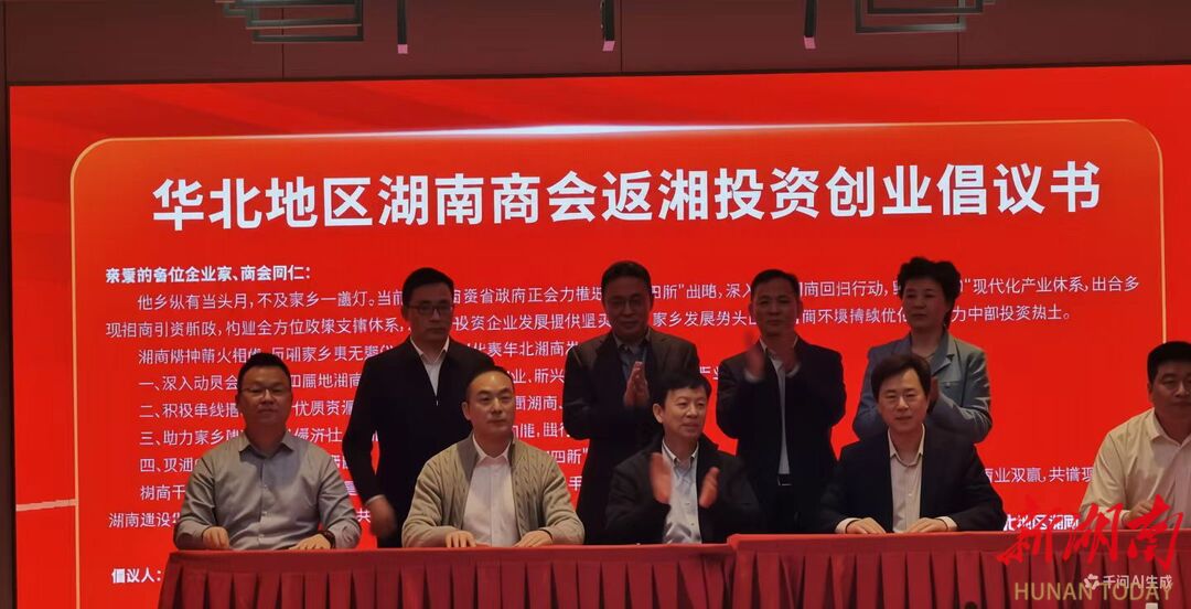 北京湖南企业商会会长周泽湘、天津市湖南商会执行会长张文武、河北省湖南商会执行会长易建元、山西省湖南商会副会长王宇、内蒙古湖南商会会长谢玉强共同发布回湘投资倡议书:深入动员会员企业和属地湘商返乡投资,聚焦优势产业、新兴产业补链延链,共筑产业高地;积极牵线搭桥,对接优质资源,凝聚招商合力,推介新质湖南;助力家乡建设,服务经济社会高质量发展,激发商会动能,践行企业社会责任;贯通内引外联,助推双向奔赴,协同政商联动,为湖南“三高四新”贡献异地湘商力量!