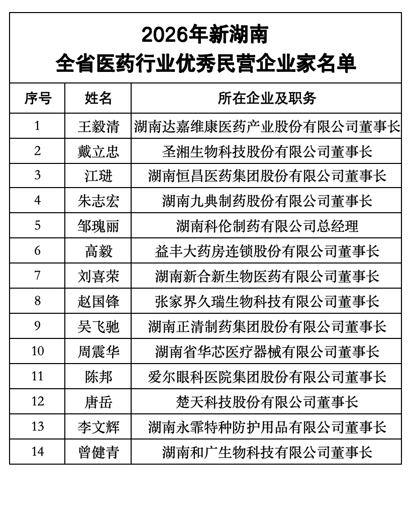 当前,湖南正加快构建“4×4”现代化产业体系,生物医药作为战略性新兴产业迎来重要机遇。业内人士认为,多位医药企业家获此表彰,既体现了“医药湘军”的创新活力,也将进一步激发行业深耕主业、做强实业的信心与动力。