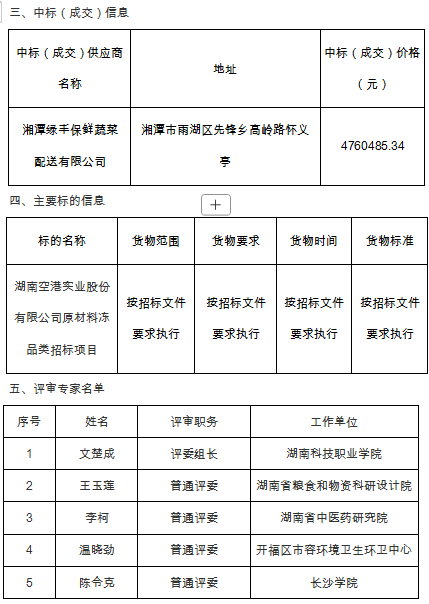 湖南空港实业股份有限公司原材料冻品类招标项目结果公告